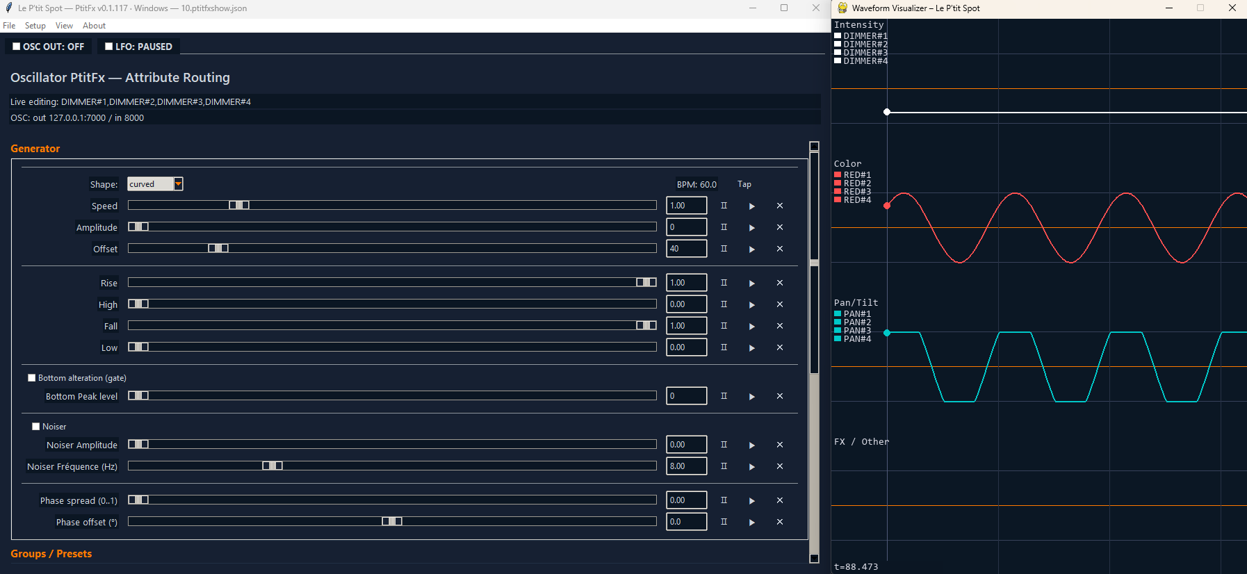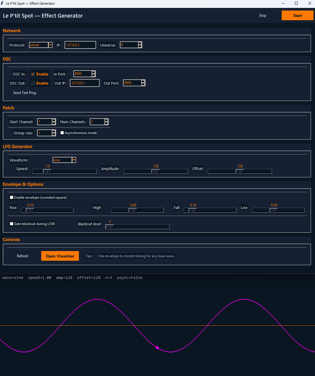 To discuss the software, you are welcome to join the Discord: PtitFx Discord server . PtitFx generates LFOs/effects (chases, pulses, ramp, sine, random…) to drive channels via OSC. It’s built for live use: a clean UI, real-time visualizer, straightforward controls (amplitude, offset, speed/frequency, phase, width) and shareable .json presets.